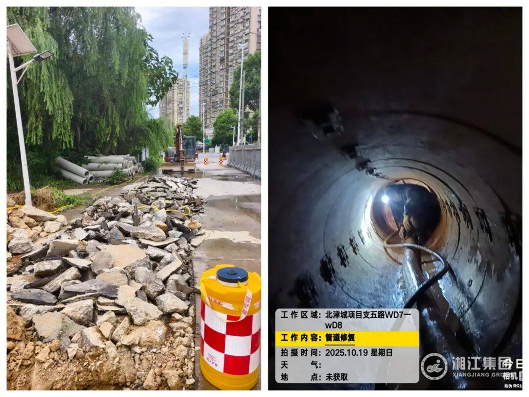 因道路两厢用地雨污分流不彻底、雨污水管网混接错接等问题,北津城路箱涵旱季存在污水流入现象,末端高排口直排湘江,2024年监测显示该雨水箱涵水质为劣Ⅴ类。接到整治任务后,湘新楚和公司迅速启动应急施工,于8月正式进场,以“见急而动”的担当推进问题整改。